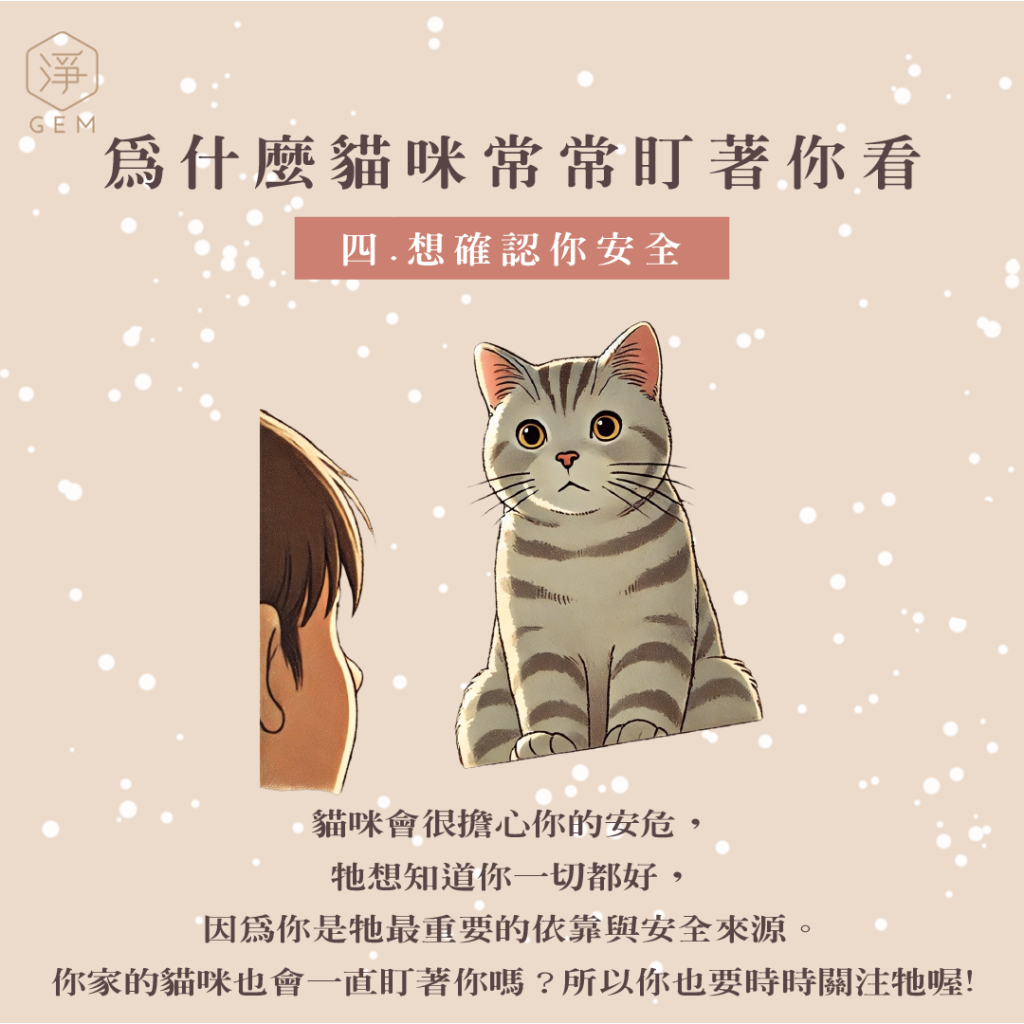 | ❶表達信任 貓咪只有對完全信任的人,才會直視對方, 如果你家的貓會一直看著你, 代表你家的貓咪對你有極高程度的親密表現。 ❷想討吃的或關注 那是牠在用眼神“傳訊息”給親愛的主人, 希望你能注意牠、回應牠的需求 或是邊叫你邊走去牠想要你注意的地方。 ❸觀察你的行動 貓咪盯著你可能也是好奇你在做什麼, 並試圖判斷下一步是否與牠有關或是牠是不是要去保護你, 也希望你是要給牠吃零食。 ❹想確認你安全 貓咪會很擔心你的安危, 牠想知道你一切都好,因為你是牠最重要的依靠與安全來源。 你家的貓咪也會一直盯著你嗎?所以你也要時時關注牠喔! |